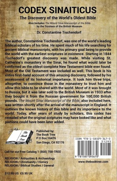 The author, Constantine Tischendorf, was one of the world’s leading biblical scholars of his time. He spent much of his life searching for ancient biblical manuscripts, with his primary goal being to provide the world with the earliest scriptures in existence. Starting in 1844 Tischedorf’s greatest discovery was made. While visiting St. Catherine’s monastery in the Sinai, he found what would later be confirmed as the oldest complete New Testament bible ever found. Most of the Old Testament was included as well. This book is his entire first-hand account of this amazing discovery, followed by his assessment of its historical importance. It took him three trips, altogether, to convince those in the monastery to trust him and allow this bible to be shared with the world. Most of it was brought to Russia, but it was later sold to the British Museum in 1933 after they bought it from the Russian government for 100,000 British pounds. The Mount Sinai Manuscript of the Bible, also included here in this Book Tree published edition, was written shortly after the arrival of the manuscript in England. It outlines the known history of this bible and its importance to the world. Today, after years of study by scholars, this codex has revealed what the original scriptures may have looked like and what portions could have been later added.