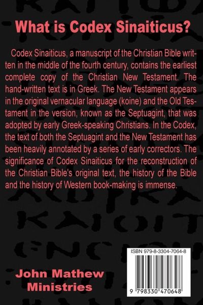 www.the-hijacked-mind.com DISCOUNT ON WEBSITE! NEW TESTAMENT ONLY (ENGLISH)! 1250 OLDER THAN THE KING JAMES VERSION! Contains The New Testament Only (Matthew-Revelation)... This has been translated into English... See how certain verses were later added by the Scribes to the most modern Manuscripts of God's Word. This Bible is a great tool to compare the Oldest Manuscript with the Newer Manuscripts... God bless all of you! What the Codex Sinaiticus is: It is a manuscript of the Christian Bible, written in Greek in the middle of the fourth century. It's one of the oldest and most complete manuscripts of the Bible and contains the earliest complete copy of the Christian New Testament. It also contains portions of the Greek Old Testament (Septuagint) and two early Christian texts: the Epistle of Barnabas and the Shepherd of Hermas. The manuscript is written on parchment (prepared animal skin). Discovery of the Codex Sinaiticus: It was discovered in the 19th century at St. Catherine's Monastery on Mount Sinai in Egypt. German biblical scholar Constantin von Tischendorf found parts of the manuscript in 1844 and again in 1859. The story surrounding its discovery, particularly Tischendorf's claim of finding it in a basket of discarded manuscripts, has been questioned by modern scholars. Significance of the Codex Sinaiticus: It's a crucial resource for understanding the history of the Christian Bible's text. It provides insights into ancient book production and scribal practices. Its presence in the Codex indicates that certain books, like the Epistle of Barnabas and the Shepherd of Hermas, were considered scripture by some Christians in the 4th century. Where to view the Codex Sinaiticus: The manuscript's leaves are now spread across four institutions: the British Library, the University of Leipzig, the National Library of Russia, and Saint Catherine's Monastery.