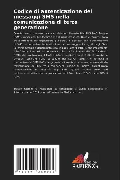 Questo lavoro propone un nuovo sistema chiamato IMN SMS MAC System (ISMS) server con due tecniche di soluzione proposte. Queste tecniche sono state introdotte per raggiungere gli obiettivi di sicurezza per la trasmissione di SMS, in particolare l'autenticazione dei messaggi e l'integrità degli SMS. La prima tecnica è denominata MAC To Each Record (MTER), che implementa il MAC in ogni record. La seconda tecnica sarà chiamata MAC To DataBase (MTD) che implementa il MAC all'intero database degli SMS. Entrambe le soluzioni tecniche sono contenute nel server ISMS che fornisce il meccanismo di SMS-MAC che garantisce i servizi di sicurezza interessati alla trasmissione di SMS tra i componenti trasmessi. Inoltre, garantiscono l'autenticazione e l'integrità degli SMS. Questi risultati sono stati implementati utilizzando un processore Intel Core duo a 2.00GHz con 3GB di Ram.