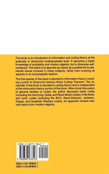 This book is an introduction to information and coding theory at the graduate or advanced undergraduate level. It assumes a basic knowledge of probability and modern algebra, but is otherwise self- contained. The intent is to describe as clearly as possible the fundamental issues involved in these subjects, rather than covering all aspects in an encyclopedic fashion. The first quarter of the book is devoted to information theory, including a proof of Shannon's famous Noisy Coding Theorem. The remainder of the book is devoted to coding theory and is independent of the information theory portion of the book. After a brief discussion of general families of codes, the author discusses linear codes (including the Hamming, Golary, the Reed-Muller codes), finite fields, and cyclic codes (including the BCH, Reed-Solomon, Justesen, Goppa, and Quadratic Residue codes). An appendix reviews relevant topics from modern algebra.