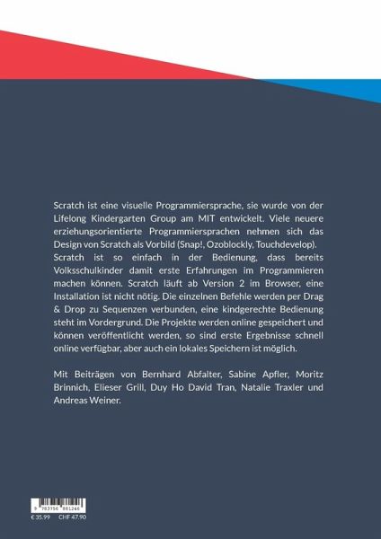 Scratch ist eine visuelle Programmiersprache, sie wurde von der Lifelong Kindergarten Group am MIT entwickelt. Viele neuere erziehungsorientierte Programmiersprachen nehmen sich das Design von Scratch als Vorbild (Snap!, Ozoblockly, Touchdevelop).Scratch ist so einfach in der Bedienung, dass bereits Volksschulkinder damit erste Erfahrungen im Programmieren machen können. Scratch läuft ab Version 2 im Browser, eine Installation ist nicht nötig. Die einzelnen Befehle werden per Drag & Drop zu Sequenzen verbunden, eine kindgerechte Bedienung steht im Vordergrund. Die Projekte werden online gespeichert und können veröffentlicht werden, so sind erste Ergebnisse schnell online verfügbar, aber auch ein lokales Speichern ist möglich.Mit Beiträgen von Bernhard Abfalter, Sabine Apfler, Moritz Brinnich, Elieser Grill, Duy Ho David Tran, Natalie Traxler und Andreas Weiner.