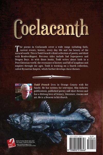 The poems in Coelacanth cover a wide range including faith, current events, history, every day life and the beauty of the natural world. This is Todd French's third collection of poetry and third with ReadersMagnet. Previous titles include Sad Superpower and Dragon Days. As with those books, Todd writes about faith in a Post-Christian world, the resonance of history and fall of kingdoms and empires through the ages. Todd is working on a fourth collection, called Byzantine Empire, which further develops these themes.