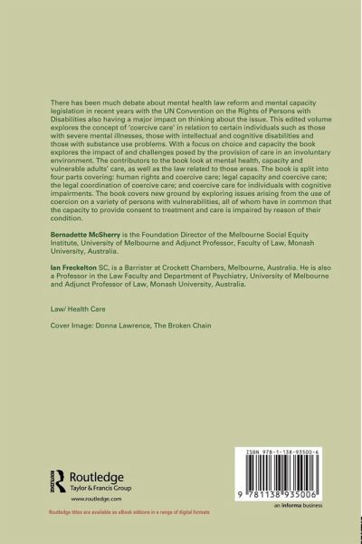 This edited volume explores the concept of 'coercive care' in relation to individuals such as those with severe mental illnesses, those with intellectual and cognitive disabilities and those with substance use problems. With a focus on choice and capacity the book explores the impact of and challenges posed by the provision of care in an involuntary environment. The book covers new ground by exploring issues arising from the coercion of persons with various disabilities and vulnerabilities, helping to illustrate how the capacity to provide consent to treatment and care is impaired by reason of their condition.