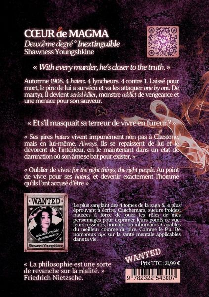 "With every murder, he's closer to the truth."Automne 1908. 4 haters. 4 lyncheurs. 4 contre un. Laissé pour mort, le pire de lui a survécu, et va les attaquer one by one. De martyr, il devient serial killer, monstre addict de vengeance."Et s'il masquait sa terreur de vivre en fureur ?"" Ses pires haters vivent impunément, non pas à Clæstone, mais en lui-même. Always. Ils se repaissent de lui et le dévorent de l'intérieur, en le maintenant dans un état de damnation où son âme se bat pour exister."" Oublier de vivre for the right things, the right people. Au point de vivre pour ses haters, et devenir exactement l'homme qu'ils l'ont accusé d'être. "" La philosophie est une sorte de revanche sur la réalité."Nietzsche.Booktrailer : https://youtube.com/shorts/2As2SoPhifw?si=kgpQzqdxUgTrHaLV