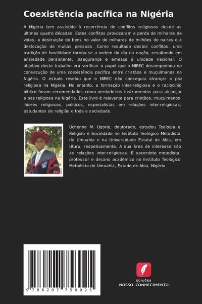 A Nigéria tem assistido à recorrência de conflitos religiosos desde as últimas quatro décadas. Estes conflitos provocaram a perda de milhares de vidas, a destruição de bens no valor de milhares de milhões de nairas e a deslocação de muitas pessoas. Como resultado destes conflitos, uma tradição de hostilidade tornou-se a ordem do dia na nação, resultando em ansiedade persistente, insegurança e ameaça à unidade nacional. O objetivo deste trabalho era verificar o papel que o NIREC desempenhou na consecução de uma coexistência pacífica entre cristãos e muçulmanos na Nigéria. O estudo revelou que o NIREC não conseguiu alcançar a paz religiosa na Nigéria. No entanto, a formação inter-religiosa e o raciocínio bíblico foram recomendados como verdadeiros instrumentos para alcançar a paz religiosa na Nigéria. Este livro é relevante para cristãos, muçulmanos, líderes religiosos, políticos, especialistas em relações inter-religiosas, estudantes de religião e toda a sociedade.