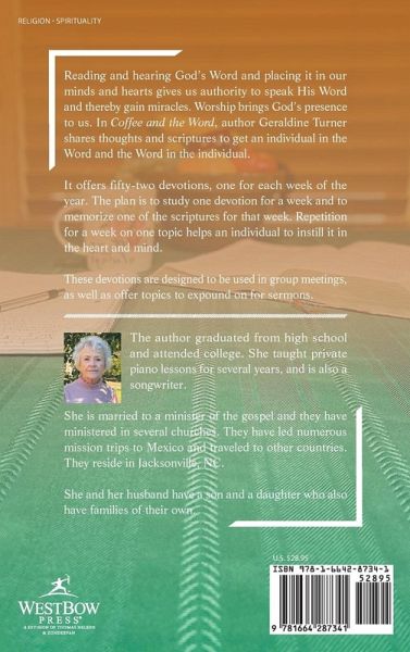 Reading and hearing God's Word and placing it in our minds and hearts gives us authority to speak his Word and thereby gain miracles. Worship brings God's presence to us. In Coffee and the Word, author Geraldine Turner shares thoughts and scriptures to get an individual in the Word and the Word in the individual. It offers fifty-two devotions, one for each week of the year. The plan is to study one devotion for a week and to memorize one of the scriptures for that week. Repetition for a week on one topic helps an individual to instill it in the heart and mind. These devotions are designed to be used in group meetings, as well as offer topics to expound on for sermons.