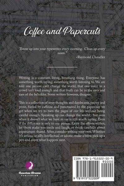 "Throw up into your typewriter every morning. Clean up every noon." Raymond Chandler * Writing is a constant, living, breathing thing. Everyone has something worth saying; something worth listening to. We are told one person can't change the world, that one voice in a crowd isn't loud enough and that truth can be in the eyes and ears of the beholder. Some writers, however, disagree. This is a collection of stray thoughts and daydreams, poetry and prose, fueled by caffeine and punctuated by the papercuts we get when we try to turn the pages of our life without being careful enough. Speaking up can change the world... but even when it doesn't what we have to say is still worth saying. Even if the difference is only to one person. Enjoy the efforts within, let them make you smile and laugh, or think carefully about experiences shared. After, consider writing your own. Whether it's serious or silly, intellectual or idiotic, make a brew, pick up a pen and enjoy what happens next.