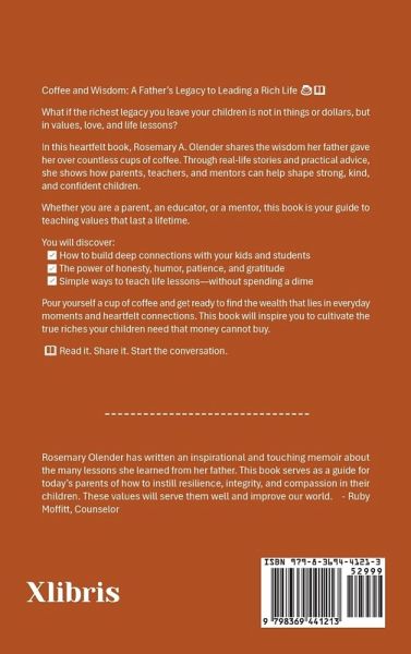 Coffee and Wisdom: A Father's Legacy to Leading a Rich Life What if the richest legacy you leave your children is not in things or dollars, but in values, love, and life lessons? In this heartfelt book, Rosemary A. Olender shares the wisdom her father gave her over countless cups of coffee. Through real-life stories and practical advice, she shows how parents, teachers, and mentors can help shape strong, kind, and confident children. Whether you are a parent, an educator, or a mentor, this book is your guide to teaching values that last a lifetime. You will discover: How to build deep connections with your kids and students The power of honesty, humor, patience, and gratitude Simple ways to teach life lessons-without spending a dime Pour yourself a cup of coffee and get ready to find the wealth that lies in everyday moments and heartfelt connections. This book will inspire you to cultivate the true riches your children need that money cannot buy. Read it. Share it. Start the conversation.