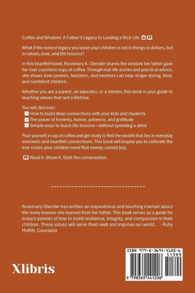Coffee and Wisdom: A Father's Legacy to Leading a Rich Life What if the richest legacy you leave your children is not in things or dollars, but in values, love, and life lessons? In this heartfelt book, Rosemary A. Olender shares the wisdom her father gave her over countless cups of coffee. Through real-life stories and practical advice, she shows how parents, teachers, and mentors can help shape strong, kind, and confident children. Whether you are a parent, an educator, or a mentor, this book is your guide to teaching values that last a lifetime. You will discover: How to build deep connections with your kids and students The power of honesty, humor, patience, and gratitude Simple ways to teach life lessons-without spending a dime Pour yourself a cup of coffee and get ready to find the wealth that lies in everyday moments and heartfelt connections. This book will inspire you to cultivate the true riches your children need that money cannot buy. Read it. Share it. Start the conversation.