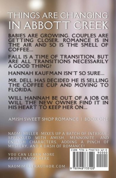 Things are changing in Abbott Creek. Babies are growing. Couples are getting closer. Romance is in the air and so is the smell of coffee... Fall is a time of transition, but are all transitions necessarily a good thing? Hannah Kaufman isn't so sure... Mr. Dell has decided he is selling The Coffee Cup and moving to Florida. Will Hannah be out of a job or will the new owner find it in his heart to keep her on...