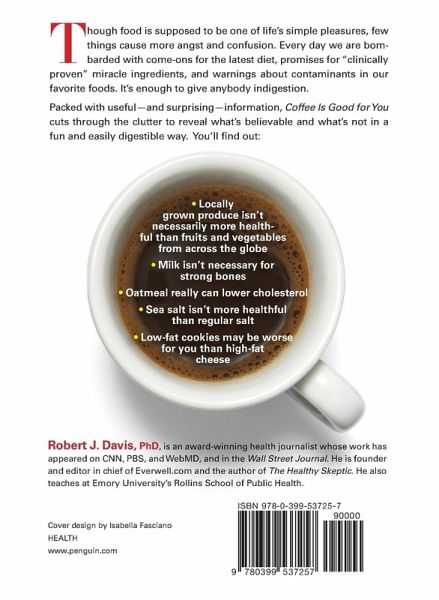 Though food is supposed to be one of life's simple pleasures, few things cause more angst and confusion. Every day we are bombarded with come-ons for the latest diet, promises for "clinically proven" miracle ingredients, and warnings about contaminants in our favorite foods. It's enough to give anybody indigestion. Packed with useful-and surprising-information, Coffee Is Good for You cuts through the clutter to reveal what's believable and what's not in a fun and easily digestible way. You'll find out: * Locally grown produce isn't necessarily more healthful than fruits and vegetables from across the globe * Alcohol does cause breast cancer * You don't need eight glasses of water a day for good health * Milk isn't necessary for strong bones * Oatmeal really can lower cholesterol * Sea salt isn't more healthful than regular salt * Low-fat cookies may be worse for you than high-fat cheese