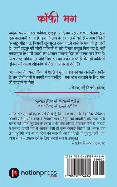 Coffee Mug - This compilation of Haiku, ghazals, poems, etc. is an artistic creation of the author. In every page of this book, there are sweet and sour moments of common life, whose beautiful composition touches the mind of the reader. While the short lines of the haiku present big ideas, the simple meaning of the heavy words of the Ghazalnuma lightens the heart. Just as Mahiya and Couplets describe different tastes, poems inspire us to look at the world from a different perspective. This book would help you to find peace and relaxation in today's busy life, just hold 'Coffee Mug' in both hands - one to amuse one's tongue, other to amuse one's soul. - Raunak, New Delhi (India)