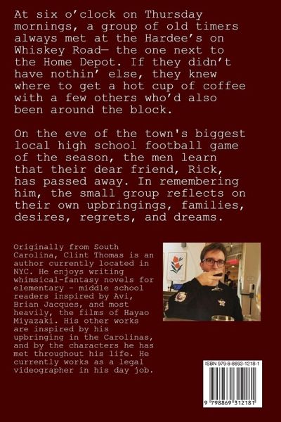 At six o'clock on Thursday mornings, a group of old timers always met at the Hardee's on Whiskey Road- the one next to the Home Depot. If they didn't have nothin' else, they knew where to get a hot cup of coffee with a few others who'd also been around the block. On the eve of the town's biggest local high school football game of the season, the men learn that their dear friend, Rick, has passed away. In remembering him, the small group reflects on their own upbringings, families, desires, regrets, and dreams.