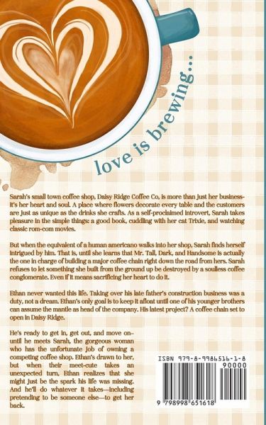 Sarah's small-town coffee shop, Daisy Ridge Coffee Co., is more than just her business- it's her heart and soul. A place where flowers decorate every table and the customers are just as unique as the drinks she crafts. As a self-proclaimed introvert, Sarah takes pleasure in the simple things: a good book, cuddling with her cat Trixie, and watching classic rom-com movies. But when the equivalent of a human Americano walks into her shop, Sarah finds herself intrigued by him. That is, until she learns that Mr. Tall, Dark, and Handsome is actually the one in charge of building a major coffee chain right down the road from hers. Sarah refuses to let something she built from the ground up be destroyed by a soulless coffee conglomerate, even if it means sacrificing her heart to do it. Ethan never wanted this life. Taking over his late father's construction business was a duty, not a dream. Ethan's only goal is to keep it afloat until one of his younger brothers can assume the mantle as head of the company. His latest project? A coffee chain set to open in Daisy Ridge. He's ready to get in, get out, and move on- until he meets Sarah, the gorgeous woman who has the unfortunate job of owning a competing coffee shop. Ethan's drawn to her, but when their meet-cute takes an unexpected turn, Ethan realizes that she might just be the spark his life was missing. And he'll do whatever it takes-including pretending to be someone else-to get her back.