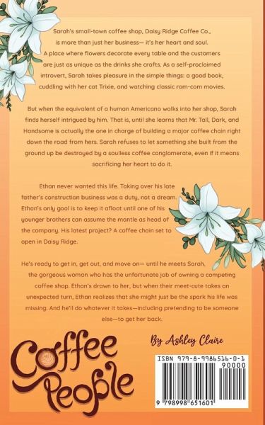 Sarah's small-town coffee shop, Daisy Ridge Coffee Co., is more than just her business- it's her heart and soul. A place where flowers decorate every table and the customers are just as unique as the drinks she crafts. As a self-proclaimed introvert, Sarah takes pleasure in the simple things: a good book, cuddling with her cat Trixie, and watching classic rom-com movies. But when the equivalent of a human Americano walks into her shop, Sarah finds herself intrigued by him. That is, until she learns that Mr. Tall, Dark, and Handsome is actually the one in charge of building a major coffee chain right down the road from hers. Sarah refuses to let something she built from the ground up be destroyed by a soulless coffee conglomerate, even if it means sacrificing her heart to do it. Ethan never wanted this life. Taking over his late father's construction business was a duty, not a dream. Ethan's only goal is to keep it afloat until one of his younger brothers can assume the mantle as head of the company. His latest project? A coffee chain set to open in Daisy Ridge. He's ready to get in, get out, and move on- until he meets Sarah, the gorgeous woman who has the unfortunate job of owning a competing coffee shop. Ethan's drawn to her, but when their meet-cute takes an unexpected turn, Ethan realizes that she might just be the spark his life was missing. And he'll do whatever it takes-including pretending to be someone else-to get her back.