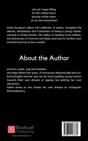 """"""why do i keep falling for the coffee lovers leaving coffee stains on my tea-loving heart emma burgess's debut mini-collection of poetry navigates the desires, temptations and frustrations of being a young human: wanting to chase dreams, the reality of needing to be realistic, the elusiveness of true love and deep yearning for another soul, and learning how to love oneself.""""""