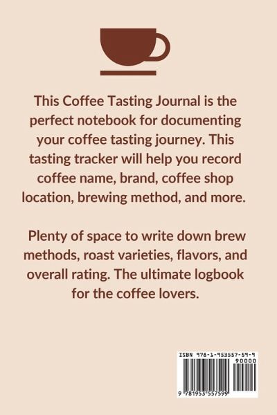 This Coffee Tasting Journal is the perfect notebook for documenting your coffee tasting journey. This tasting tracker will help you record coffee name, brand, coffee shop location, roasting, brewing method, and more. Plenty of space to write down brew methods, roast varieties, flavors, and overall rating. The ultimate logbook for the coffee lovers. Features:Drink Name, Brand- record coffee name and brand name Date- record the date you tasted the coffee Shop Name, Location- record the shop name and location where the purchase was made Bean Type and Origin- list types of beans (Arabica, Liberica, Robusta) and origin Brew Method- checklist for brew method (expresso, pour-over, drip, etc.) Roast- checklist for type of roast (blonde, medium, expresso) Coffee Original Name, Roaster, Roasting Date- fill in roasting information Flavors- use checklist for flavor types Flavor Add-Ins- space to write any additional ingredients Notes- space to jot down any additional information Rating- rate coffee from 1-10 Drink Again? Would you drink this coffee again? Check: yes or no Details:Size: 6" x 9" Pages: 104 Paperback Matte finish Makes a great gift for the coffee connoisseur and homebrewers. Perfect gift for the casual coffee drinker or seasoned coffee fanatic.