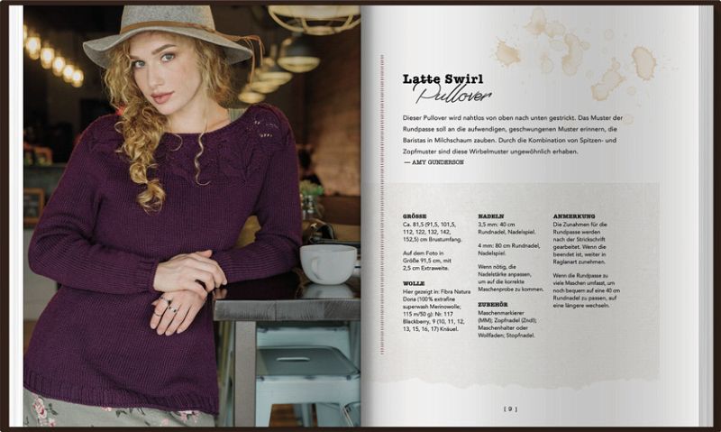 Strickanleitungen für Damenpullover, Strickjacken, Mützen und Socken mit Abbildungen und Tipps für eine gelungene Ausführung Designs inspiriert von Kaffee und allem, was eine heiße Tasse davon so entspannend macht Hilfe für Profis und für alle, die erst Stricken lernen: Detailabbildungen, Schritt-für-Schritt-Anleitungen und Schemata Strickvorlagen unterteilt nach Projekten für stille Stunden und solchen, die während eines Tratsches fortgeführt werden können. Kurze Essays der strickbegeisterten Co-Autorinnen, die über die Entspannung der Handarbeit philosophieren und zu eigenen Stricktreffen inspirieren