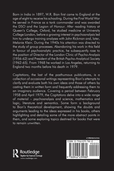 Cogitations, the last of the posthumous publications, is a collection of occasional writings representing Bion's attempts to clarify and evaluate both his own ideas and those of others by casting them in written form and frequently addressing them to an imaginary audience. Covering a period between February 1958 and April 1979, Cogitations delves into a wide range of material - psychoanalysis and science, mathematics and logic, literature and semantics. Some form a background to Bion's theoretical development, showing the doubts and arguments leading to the ideas expressed in his books, others highlighting and detailing some of the more abstract points in them, and some exploring topics destined for books that were to remain unwritten.
