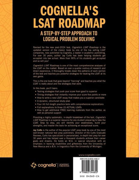 Revised for the new post-2024 test, Cognella's LSAT Roadmap is the updated version of the classic book by one of the top selling LSAT companies, now published by Cognella, a leader in academic publishing. For over 30 years, author Jay Cutts has been helping students get accepted into law school. More than 90% of his students get accepted and so will you! Cognella's LSAT Roadmap is one of the most comprehensive analyses of the LSAT on the market. Based on over a quarter century of research and direct experience, it thoroughly breaks down the patterns of each section of the test and teaches you powerful strategies for beating the LSAT at its own game. This is the one book that goes beyond "training" and teaches you what the LSAT is really about and the strategies that work. In this book, you'll learn: - Testing strategies that push your score from good to superior - Timing strategies that instantly improve your score five points or more - How to write a new LSAT essay that makes you a superior candidate - A dynamic, structured study plan - Four (4) full-length practice tests with comprehensive explanations - Full explanations to three (3) ACTUAL LSATs - How to get additional FREE learning materials from the author, as well as personal support Providing a highly systematic, in-depth breakdown of the test, Cognella's LSAT Roadmap is a superior resource for any student preparing to take the LSAT. Step by step, you will identify your weaknesses, build your strengths, and master the tools for achieving an exceptional score.