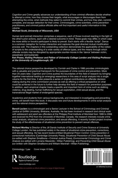 Dr Benoit Leclerc is a criminologist in the School of Criminology and Criminal Justice at Griffith University, Brisbane, Australia. He has been involved in research and clinical work with adolescent and adult sex offenders at the Philippe-Pinel Institute of Montréal for 7 years and received his Ph.D. from the Université of Montréal, Canada. His research interests include crime script analysis, situational crime prevention and sexual offending. A recent funded project involves the study of the effectiveness of situational crime prevention to prevent sexual offences. Professor Richard Wortley is Director of the Jill Dando Institute of Crime Science at University College London. He has published widely in the areas of situational crime prevention, corrections and sexual offending. He has recent books entitled Situational Prison Control: Crime Prevention in Correctional Institutions (Cambridge University Press), Situational Prevention of Child Sexual Abuse (co-edited with Stephen Smallbone - Criminal Justice Press), Environmental Criminology and Crime Analysis (co-edited with Lorraine Mazerolle - Willan Publishing), and Preventing Child Sexual Abuse (co-written with Stephen Smallbone and William Marshall - Willan Publishing).