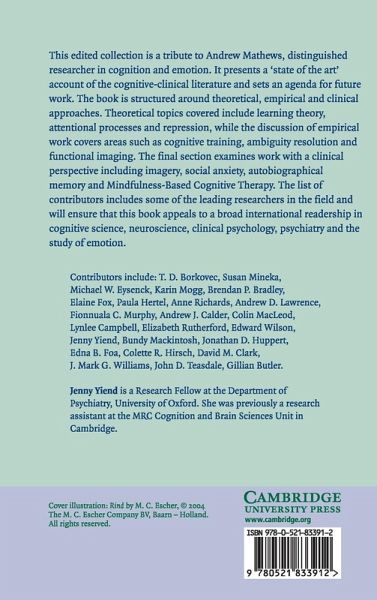 An introduction and synthesis Jenny Yiend; Andrew Mathews: a brief history of a clinical scientist T. D. Borkovec; Part I. Theoretical Approaches: 1. The positive and negative consequences of worry in the etiology of generalized anxiety disorder: a learning theory perspective Susan Mineka; 2. Trait anxiety, repressors, and cognitive biases Michael W. Eysenck; 3. A cognitive-motivational perspective on the processing of threat information and anxiety Karin Mogg and Brendan P. Bradley; 4. Maintenance or capture of attention in anxiety related biases? Elaine Fox; Part II. Empirical Directions: 5. Habits of thought produce memory biases in anxiety and depression Paula Hertel; 6. Anxiety and the resolution of ambiguity Anne Richards; 7. Dissociative methods in the study of emotion Andrew D. Lawrence, Fionnuala C. Murphy and Andrew J. Calder; 8. The causal status of anxiety-linked attentional and interpretive bias Colin MacLeod, Lynlee Campbell, Elizabeth Rutherford and Edward Wilson; 9. The experimental modification of processing biases Jenny Yiend and Bundy Mackintosh; Part III. Clinical Perspectives: 10. Maintenance mechanisms in social anxiety: an integration of cognitive biases and emotional processing theory Jonathan D. Huppert and Edna B. Foa; 11. Mental imagery and social phobia Colette R. Hirsch and David M. Clark; 12. Experimental cognitive psychology and clinical practice: autobiographical memory as a paradigm case J. Mark G. Williams; 13. Mindfulness-based cognitive therapy John D. Teasdale; 14. Clinical difficulties to revisit Gillian Butler.