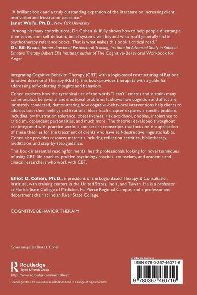 Integrating Cognitive Behavior Therapy (CBT) with a logic-based restructuring of Rational Emotive Behavioral Therapy (REBT), this book provides therapists with a guide for addressing self-defeating thoughts and behaviors. Cohen explores how the tyrannical use of the words "I can't" creates and sustains many commonplace behavioral and emotional problems. It shows how cognition and affect are intimately connected, demonstrating how cognitive-behavioral interventions help clients to address both their feelings and irrational ideas. Each chapter explores a specific problem, including low frustration tolerance, obsessiveness, risk avoidance, phobias, intolerance to criticism, dependent personalities, and much more. The theories developed throughout are integrated with practice sections and session transcripts that focus on the application of these theories for the treatment of clients who have self-destructive linguistic habits. Cohen also provides resource materials including reflection activities, bibliotherapy, meditation, and step-by-step guidance. This book is essential reading for mental health professionals looking for novel techniques of using CBT, life coaches, positive psychology coaches, counselors, and academic and clinical researchers who work with CBT.
