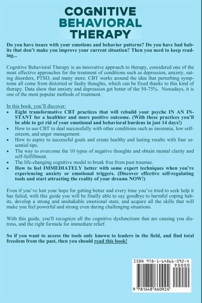 Do you have issues with your emotions and behavior patterns? Do you have bad habits that don't make you improve your current situation? Then you need to keep reading... Cognitive Behavioral Therapy is an innovative approach to therapy, considered one of the most effective approaches for the treatment of conditions such as depression, anxiety, eating disorders, PTSD, and many more. CBT works around the idea that perturbing symptoms all come from distorted or faulty thoughts, which can be fixed thanks to this kind of therapy. Data show that anxiety and depression get better of the 50-75%. Nowadays, it is one of the most popular methods of treatment In this book, you'll discover: Even if you've lost your hope for getting better and every time you've tried to seek help it has failed, with this guide you will be finally able to say goodbye to harmful coping habits, develop a strong and unshakable emotional state, and acquire all the skills that will make you feel powerful and strong even during challenging situations. With this guide, you'll recognize all the cognitive dysfunctions that are causing you distress, and the right formula for immediate relief. So if you want to access the tools only known to leaders in the field, and find total freedom from the past, then you should read this book!