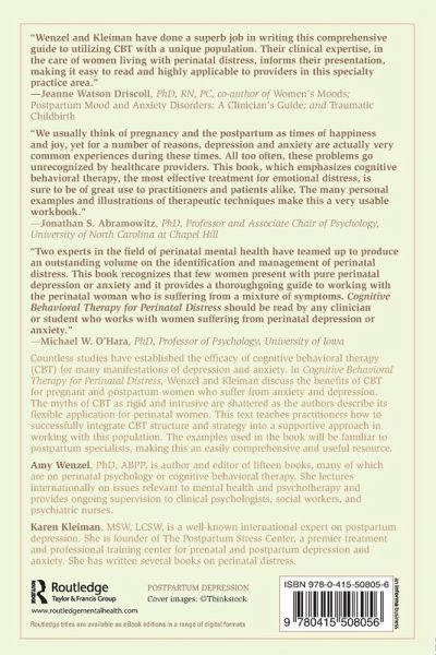 Countless studies have established the efficacy of cognitive behavioral therapy (CBT) for many manifestations of depression and anxiety. In Cognitive Behavioral Therapy for Perinatal Distress, Wenzel and Kleiman discuss the benefits of CBT for pregnant and postpartum women who suffer from emotional distress. The myths of CBT as rigid and intrusive are shattered as the authors describe its flexible application for perinatal women. This text teaches practitioners how to successfully integrate CBT structure and strategy into a supportive approach in working with this population. The examples used in the book will be familiar to postpartum specialists, making this an easily comprehensive and useful resource.