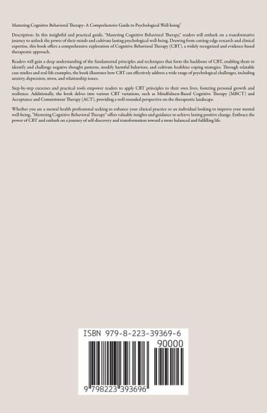 Mastering Cognitive Behavioral Therapy: A Comprehensive Guide to Psychological Well-being" Description: In this insightful and practical guide, "Mastering Cognitive Behavioral Therapy," readers will embark on a transformative journey to unlock the power of their minds and cultivate lasting psychological well-being. Drawing from cutting-edge research and clinical expertise, this book offers a comprehensive exploration of Cognitive Behavioral Therapy (CBT), a widely recognized and evidence-based therapeutic approach. Readers will gain a deep understanding of the fundamental principles and techniques that form the backbone of CBT, enabling them to identify and challenge negative thought patterns, modify harmful behaviors, and cultivate healthier coping strategies. Through relatable case studies and real-life examples, the book illustrates how CBT can effectively address a wide range of psychological challenges, including anxiety, depression, stress, and relationship issues. Step-by-step exercises and practical tools empower readers to apply CBT principles to their own lives, fostering personal growth and resilience. Additionally, the book delves into various CBT variations, such as Mindfulness-Based Cognitive Therapy (MBCT) and Acceptance and Commitment Therapy (ACT), providing a well-rounded perspective on the therapeutic landscape. Whether you are a mental health professional seeking to enhance your clinical practice or an individual looking to improve your mental well-being, "Mastering Cognitive Behavioral Therapy" offers valuable insights and guidance to achieve lasting positive change. Embrace the power of CBT and embark on a journey of self-discovery and transformation toward a more balanced and fulfilling life.