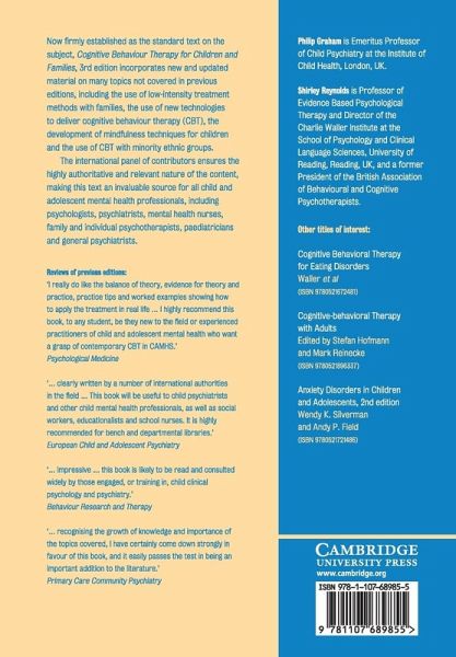Preface; 1. Introduction Philip Graham and Shirley Reynolds; Part I. Developmental Cognitive Theory and Clinical Practice: 2. Anxiety and depression in young people: developmental considerations Jennifer Lau, Kevin Hilbert and Alice Gregory; 3. Adapting cognitive and behavioural therapy for children and adolescents Paul Stallard; 4. Issues in evaluation of psychotherapies Miranda Wolpert, Andrew Fugard and Jessica Deighton; Part II. Engagement and Assessment: 5. Engagement Isabel Boege and Dennis Ougrin; 6. Formulation: a systematic approach in cognitive behaviour therapy Nicola Dummett; Part III. Client Groups: 7. Working collaboratively with parents and carers in cognitive behaviour therapy Cathy Creswell, Sam Cartwright-Hatton and Natalie Rodriguez; 8. Working with black and ethnic minority children and their families Iyabo Ayodele Fatimilehin and Amira Hassan; 9. Working with schools and children's wider social environment Peter Fuggle and Sandra Dunsmuir; Part IV. Cognitive Approaches to Children Facing Adversity: 10. Trauma-focused cognitive behavioural therapy for child sexual abuse Judith A. Cohen, Laura A. Murray and Anthony P. Mannarino; 11. Children with chronic and life-limiting health problems Melinda Edwards and Inés Banos; 12. Cognitive approaches to children with chronic pain Ellen Trautmann; Part V. Applications in Specific Child and Adolescent Syndromes: 13. Cognitive behavioural therapies for youth with autistic spectrum disorders Jeffrey J. Wood and Benjamin C. Schwartzman; 14. Eating disorders Beth Watkins; 15. Treating broad-based anxiety problems in children Carol Newall, Helen F. Dodd, Jennifer L. Hudson and Ronald M. Rapee; 16. Post-traumatic stress disorders David Trickey; 17. Phobic anxiety Ella L. Milliner, Lara J. Farrell and Tom H. Ollendick; 18. Obsessive compulsive disorder Sarah Clark and Shirley Reynolds; 19. Depressive disorders Shirley Reynolds and Sarah Clark; Part VI. CBT Applications in Preventive Interventions: 20. Prevention of conduct disorders: cognitive behavioural approaches Stephen Scott; 21. Prevention of anxiety disorders Jennifer L. Allen, Cathy Creswell and Lynne Murray; Part VII. New Developments in CBT for Children: 22. Using low intensity treatment methods with families Cynthia M. Turner and Georgina C. Krebs; 23. Using new technologies to deliver cognitive behaviour therapy with children and adolescents Caroline Donovan, Sue Spence and Sonja March; 24. Mindfulness interventions in child and adolescent psychopathology Susan M. Bögels, Esther I. de Bruin, and Saskia van der Oord; 25. Conclusions and future directions Shirley Reynolds and Philip Graham; Index.