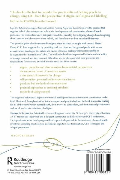 Cognitive Behaviour Therapy: A Practical Guide to Helping People Take Control explores the premise that negative beliefs play an important role in the development and continuation of mental health problems. The book offers a new integrative model of causality for instigating change, based on giving clients control and choice over these beliefs, and therefore over their mood and behaviour. This practical guide also focuses on the stigmas often attached to people with 'mental illness'. Danny C. K. Lam suggests that by providing both the client and the general public with a more accurate understanding of the nature and causes of mental health problems it is possible to de-stigmatise the 'mental illness' label. This will help the client improve self-esteem and the ability to manage personal and interpersonal difficulties and take control of their problems and responsibility for recovery. Divided into six parts, this book covers: stigma, prejudice and discrimination from societal perspectives the nature and cause of emotional upsets a therapeutic framework for change self-prejudice, personal and interpersonal issues good and bad methods of communication practical approaches to assessing problems methods of taking control. This cognitive behavioural approach to mental health problems is an innovative contribution to the field. Illustrated throughout with clinical examples and practical advice, the book is essential reading for all of those involved in mental health, from nurses to counsellors, and from medical practitioners and social workers to ministers of religion.