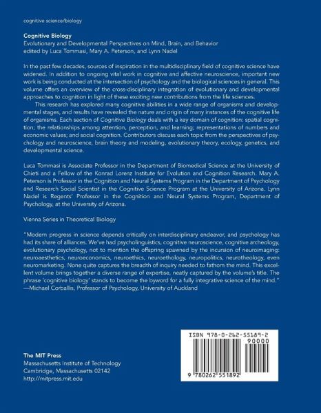 An overview of current research at the intersection of psychology and biology, integrating evolutionary and developmental data and explanations. In the past few decades, sources of inspiration in the multidisciplinary field of cognitive science have widened. In addition to ongoing vital work in cognitive and affective neuroscience, important new work is being conducted at the intersection of psychology and the biological sciences in general. This volume offers an overview of the cross-disciplinary integration of evolutionary and developmental approaches to cognition in light of these exciting new contributions from the life sciences. This research has explored many cognitive abilities in a wide range of organisms and developmental stages, and results have revealed the nature and origin of many instances of the cognitive life of organisms. Each section of Cognitive Biology deals with a key domain of cognition: spatial cognition; the relationships among attention, perception, and learning; representations of numbers and economic values; and social cognition. Contributors discuss each topic from the perspectives of psychology and neuroscience, brain theory and modeling, evolutionary theory, ecology, genetics, and developmental science. Contributors Chris M. Bird, Elizabeth M. Brannon, Neil Burgess, Jessica F. Cantlon, Stanislas Dehaene, Christian F. Doeller, Reuven Dukas, Rochel Gelman, Alexander Gerganov, Paul W. Glimcher, Robert L. Goldstone, Edward M. Hubbard, Lucia F. Jacobs, Mark H. Johnson, Annette Karmiloff-Smith, David Landy, Lynn Nadel, Nora S. Newcombe, Daniel Osorio, Mary A. Peterson, Manuela Piazza, Philippe Pinel, Michael L. Platt, Kristin R. Ratliff, Michael E. Roberts, Wendy S. Shallcross, Stephen V. Shepherd, Sylvain Sirois, Luca Tommasi, Alessandro Treves, Alexandra Twyman, Giorgio Vallortigara