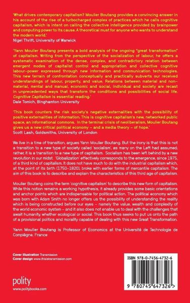 "Yann Moulier Boutang presents a bold analysis of the ongoing 'great transformation' of capitalism. Writing from the perspective of the socialization of labor, he offers a systematic examination of the dense, complex, and contradictory relation between emergent modes of capitalist control and appropriation and collective cognitive labor-power expressed through new information and communication technologies. This new terrain of confrontation conceptually and practically subverts our received understandings of labor, property, and value. Relations between material and non-material, mental and manual, economic and social, individual and society are recast in unprecedented ways that transform the conditions and possibilities of social life. Cognitive Capitalism is essential reading."