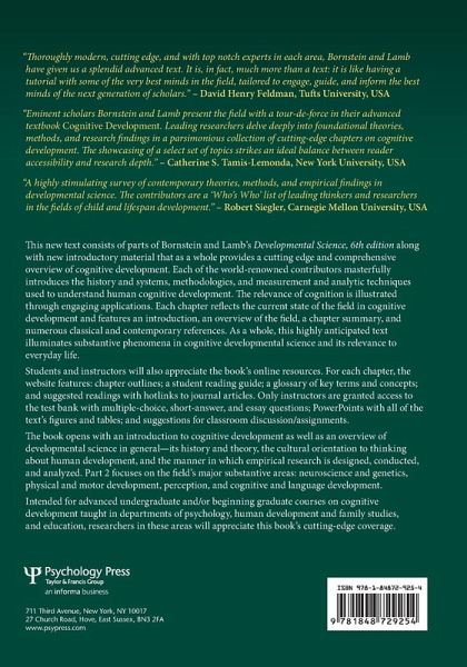 This new text consists of parts of Bornstein and Lamb's Developmental Science, 6th edition along with new introductory material that as a whole provides a cutting edge and comprehensive overview of cognitive development. Each of the world-renowned contributors masterfully introduces the history and systems, methodologies, and measurement and analytic techniques used to understand human cognitive development. The relevance of cognition is illustrated through engaging applications. Each chapter reflects the current state of the field in cognitive development and features an introduction, an overview of the field, a chapter summary, and numerous classical and contemporary references. As a whole, this highly anticipated text illuminates substantive phenomena in cognitive developmental science and its relevance to everyday life. Students and instructors will also appreciate the book's online resources. For each chapter, the website features: chapter outlines; a student reading guide; a glossary of key terms and concepts; and suggested readings with hotlinks to journal articles. Only instructors are granted access to the test bank with multiple-choice, short-answer, and essay questions; PowerPoints with all of the text's figures and tables; and suggestions for classroom discussion/assignments. The book opens with an introduction to cognitive development as well as an overview of developmental science in general-its history and theory, the cultural orientation to thinking about human development, and the manner in which empirical research is designed, conducted, and analyzed. Part 2 focuses on the field's major substantive areas: neuroscience and genetics, physical and motor development, perception, and cognitive and language development. Intended for advanced undergraduate and/or beginning graduate courses on cognitive development taught in departments of psychology, human development and family studies, and education, researchers in these areas will appreciate this book's cutting-edge coverage.
