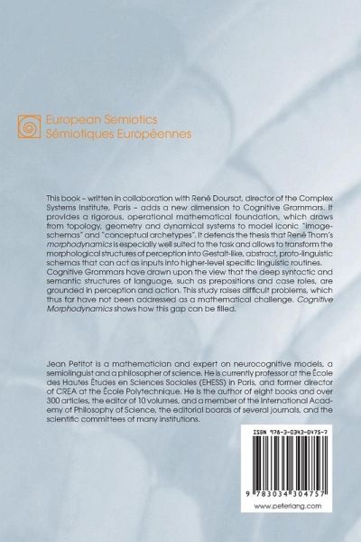 This book - written in collaboration with René Doursat, director of the Complex Systems Institute, Paris - adds a new dimension to Cognitive Grammars. It provides a rigorous, operational mathematical foundation, which draws from topology, geometry and dynamical systems to model iconic «image-schemas» and «conceptual archetypes». It defends the thesis that René Thom's morphodynamics is especially well suited to the task and allows to transform the morphological structures of perception into Gestalt-like, abstract, proto-linguistic schemas that can act as inputs into higher-level specific linguistic routines.