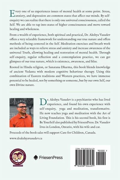 Every one of us experience issues of mental health at some point. Stress, anxiety, and depression are common states that affect our minds. By selfenquiry we can realize that there is only one universal consciousness, called the Self. We are able to tap into states of higher consciousness and move toward healing and wholeness. From a wealth of experience, both spiritual and practical, Dr. Akshya Vasudev offers a very relatable framework for understanding our true nature and offers methods of being centered in the Self. Meditation exercises and breath work are included as ways to relieve stress and anxiety and increase awareness of the universal Truth, allowing healing and restoration of mental health. Through self-enquiry, regular reflection and a contemplation practice, we can get glimpses of our true nature, which is existence, awareness, and bliss. Rooted in Hindu religion, or Sanatana Dharma, this book blends knowledge of ancient Vedanta with modern cognitive behaviour therapy. Using this combination of Eastern traditions and Western practices, we have immense potential to be healed, not by something or someone, but by our own Self, our own Divine nature.