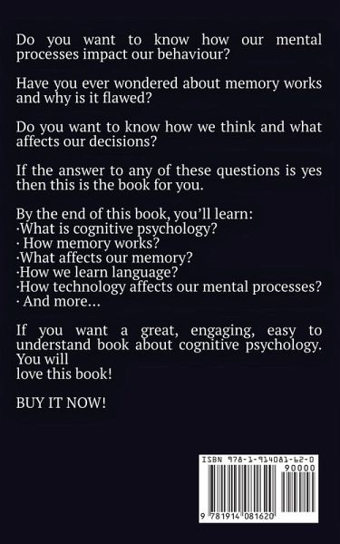 Do you want to know how our mental processes impact our behaviour? Have you ever wondered about memory works and why is it flawed? Do you want to know how we think and what affects our decisions? If the answer to any of these questions is yes then this is the book for you. By the end of this book, you'll learn:What is cognitive psychology? How memory works? What affects our memory? How we learn language? How technology affects our mental processes? And more... If you want a great, engaging, easy to understand book about cognitive psychology. You will love this book! BUY IT NOW! Cognitive Psychology Content: Introduction Part One: Memory Chapter 1: Introduction to Memory Chapter 2: Retrieval of Memory Chapter 3: Multi-Store Memory Model Chapter 4: Working Memory Model Chapter 5: Reliability of Memory Chapter 6: Episodic Memory Chapter 7: Emotion and Memory Part Two: Decision-Making, Thinking and Technology Chapter 8: Decision-Making and Thinking Chapter 9: Visual Imagery Chapter 10: Biases in Thinking Chapter 11: Decision Neuroscience Chapter 12: Cognition in A Digital World Part Three: The Psychology and Neuroscience of Learning Chapter 13: Learning: Habitual and Basis of Learning Chapter 14: Types of Learning Chapter 15: Biology of Learning and Memory Chapter 16: Schema Part Four: Social Cognition, Empathy and Emotion Chapter 17: Social Cognition, Empathy and Mirror Neurons Chapter 18: Emotion Chapter 19: Emotion Through A Social Psychology Lens Chapter 20: Emotion and Cognition Chapter 21: How Does Emotion Influence Cognition? Chapter 22: How Does Cognition Influence Emotion? Chapter 23: Does Cognition Cause Emotion? Chapter 24: The Conscious Chapter 25: The Basis of Conscious Part Five: Language Chapter 26: Language Chapter 27: How Do We Learn A Language? Part Six: Attention: Recognition, Altered Functions and Controls Chapter 28: Attention Chapter 29: Object Recognition Chapter 30: Facial Recognition Chapter 31: Altered Cognitive Functions and Neuropsychology Chapter 32: Cognitive Controls BUY NOW!
