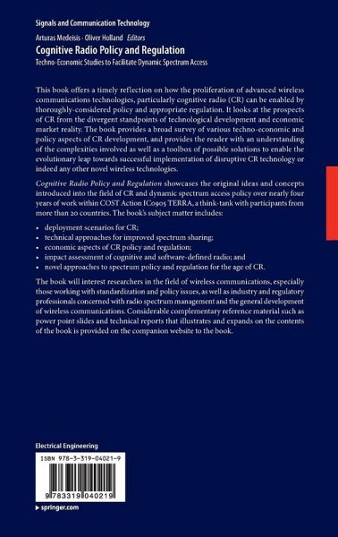 From the Contents: Part I State-of-the-Art in Policy and Regulation of the Radio Spectrum: Introduction.- Part II Deployment Scenarios for Cognitive Radio: Introduction.- Part III Technical Approaches for Improved Spectrum Sharing.- Part IV Economic Aspects of CR Policy and Regulation.- Part V Impact Assessment of CR/SDR Regulation.- Part VI Novel Approaches to Spectrum Policy and Regulation for the Age of CR.- Part VII Summary and Recommendations.