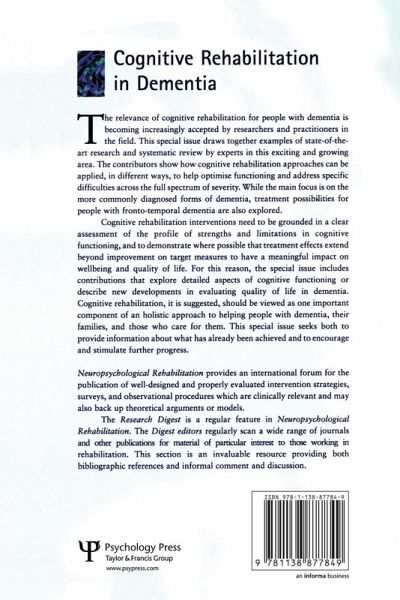 The relevance of cognitive rehabilitation for people with dementia is becoming increasingly accepted by researchers and practitioners in the field. This special issue draws together examples of state-of-the-art research and systematic review by experts in this exciting and growing area. The contributors show how cognitive rehabilitation approaches can be applied, in different ways, to help optimise functioning and address specific difficulties across the full spectrum of severity. While the main focus is on the more commonly diagnosed forms of dementia, treatment possibilities for people with fronto-temporal dementia are also explored. Cognitive rehabilitation interventions need to be grounded in a clear assessment of the profile of strengths and limitations in cognitive functioning, and to demonstrate where possible that treatment effects extend beyond improvement on target measures to have a meaningful impact on wellbeing and quality of life. For this reason, the special issue includes contributions that explore detailed aspects of cognitive functioning or describe new developments in evaluating quality of life in dementia. Cognitive rehabilitation, it is suggested, should be viewed as one important component of a holistic approach to helping people with dementia, their families, and those who care for them. This special issue seeks both to provide information about what has already been achieved and to encourage and stimulate further progress.