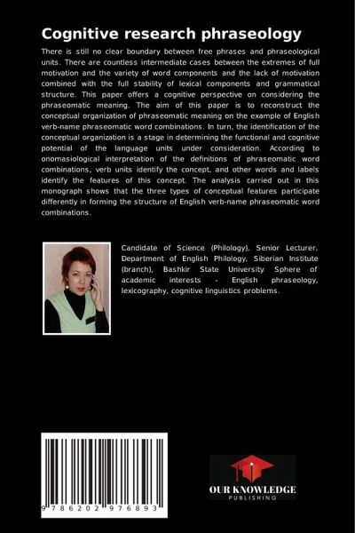 There is still no clear boundary between free phrases and phraseological units. There are countless intermediate cases between the extremes of full motivation and the variety of word components and the lack of motivation combined with the full stability of lexical components and grammatical structure. This paper offers a cognitive perspective on considering the phraseomatic meaning. The aim of this paper is to reconstruct the conceptual organization of phraseomatic meaning on the example of English verb-name phraseomatic word combinations. In turn, the identification of the conceptual organization is a stage in determining the functional and cognitive potential of the language units under consideration. According to onomasiological interpretation of the definitions of phraseomatic word combinations, verb units identify the concept, and other words and labels identify the features of this concept. The analysis carried out in this monograph shows that the three types of conceptual features participate differently in forming the structure of English verb-name phraseomatic word combinations.