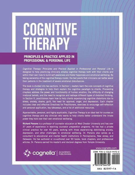 Cognitive Therapy: Principles and Practice Applied in Professional and Personal Life is designed to help practicing clinicians employ cognitive therapy both with their clients and within their own lives to build self-awareness and foster happiness and emotional wellbeing. By taking ownership of the cognitive therapy model, the text posits that clinicians can better assist their patients in the treatment of severe emotional disturbances. The book is divided into two sections. In Section I, readers learn the core concepts of cognitive therapy and strategies to help them explain the cognitive paradigm to clients. Subsequent chapters address the power and functionality of human emotion, the difficulty of changing irrational beliefs, and the need to recognize and reshape different types of distorted thinking. In Section II, practitioners learn how to help clients experiencing cognitive distortions due to stress, anxiety, shame, guilt, the need for approval, anger, and depression. Each chapter includes clear and effective Directives for Practitioners, exercises to encourage self-reflection and personal application, key takeaways, and a list of additional resources. Approachable, personal, and highly applicable, Cognitive Therapy is an ideal text for courses on cognitive therapy and any clinician who wants to help clients better understand the innate power they hold over their own emotional wellbeing. Richard Parsons is a professor of counselor education at West Chester University and has over 37 years of experience in teaching counselor preparation programs. He has had a private clinical practice for over 40 years, working with those experiencing debilitating anxiety, depression, and other challenges to emotional wellbeing. Dr. Parsons also serves as a consultant to educational and mental health institutions in Pennsylvania, New Jersey, and Delaware. He has authored or co-authored over 90 books, book chapters, and professional articles. Dr. Parsons earned his master's and doctoral degrees from Temple University.