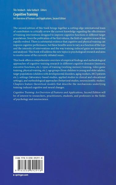 Chapter 1. Introduction.- Section I: Basic concepts and methodology.- Chapter 2. Methods and designs.- Chapter 3. Theoretical models of training and transfer effects.- Chapter 4. Statistical modeling of latent change.- Chapter 5. Training-related neural plasticity.- Chapter 6. Cognitive plasticity and brain stimulation.- Chapter 7. Individual differences and motivational effects.- Chapter 8. Genetics of neurocognitive plasticity.- Section II: Plasticity in different age groups.- Chapter 9. Childhood and adolescence.- Chapter 10. Middle & late adulthood.- Chapter 11. Very old age.- Section III: Plasticity of different cognitive domains.- Chapter 12. Working memory.- Chapter 13. Episodic memory.- Chapter 14. Prospective memory.- Chapter 15. Executive functions.- Chapter 16. Speed of processing.- Chapter 17. Socio-cognitive processes.- Section IV: Multidomain trainings.- Chapter 18. Action video-game training and its effects on perception and attentional control.- Chapter 19. Video-game training and effects on executive functions.- Chapter 20. Mindfulness and meditation training.- Chapter 21. Meta-cognitive training.- Chapter 22. Commercial brain games.- Chapter 23. Music training.- Chapter 24. Physical training.- Section V: Cognitive training in applied contexts.- Chapter 25. Educational application of working-memory training.- Chapter 26. Cognitive training in children with neurodevelopmental disorders.- Chapter 27. Training-related neurophysiological changes in older age: senior workers and drivers.- Chapter 28. Cognitive training in MCI patients.- Section VI: Outlook.- Chapter 29. The future of cognitive training.