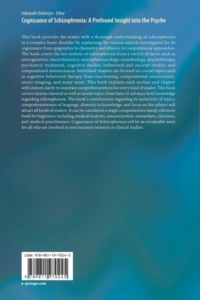 This book provides the reader with a thorough understanding of schizophrenia as a complex brain disorder by explaining the various aspects investigated for its cognizance from epigenetics to chemistry and physics to computational approaches. The book covers the key notions of schizophrenia from a variety of facets such as neurogenetics, neurochemistry, neuropharmacology, neurobiology, psychotherapy, psychiatric treatment, cognitive studies, behavioral and societal studies, and computational neurosciences. Individual chapters are focused on crucial topics such as cognitive-behavioral therapy, brain functioning, computational neuroscience, neuro-imaging, and many more. This book explains each section and chapter with utmost clarity to maintain comprehensiveness for every kind of reader. This book covers various classical as well as recent topics from basic to advance level knowledge regarding schizophrenia. The book's contributions regarding its inclusivity of topics, comprehensiveness of language, diversity in knowledge, and focus on the subject will attract all kinds of readers. It can be considered a single comprehensive handy reference book for beginners, including medical students, neuroscientists, researchers, clinicians, and medical practitioners. Cognizance of Schizophrenia will be an invaluable asset for all who are involved in neuroscience research or clinical studies.