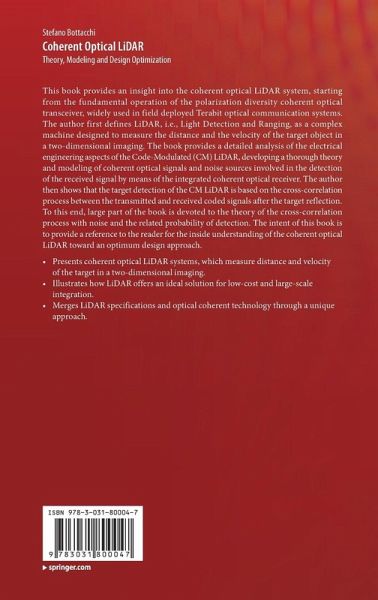 This book provides an insight into the coherent optical LiDAR system, starting from the fundamental operation of the polarization diversity coherent optical transceiver, widely used in field deployed Terabit optical communication systems. The author first defines LiDAR, i.e., Light Detection and Ranging, as a complex machine designed to measure the distance and the velocity of the target object in a two-dimensional imaging. The book provides a detailed analysis of the electrical engineering aspects of the Code-Modulated (CM) LiDAR, developing a thorough theory and modeling of coherent optical signals and noise sources involved in the detection of the received signal by means of the integrated coherent optical receiver. The author then shows that the target detection of the CM LiDAR is based on the cross-correlation process between the transmitted and received coded signals after the target reflection. To this end, large part of the book is devoted to the theory of the cross-correlation process with noise and the related probability of detection. The intent of this book is to provide a reference to the reader for the inside understanding of the coherent optical LiDAR toward an optimum design approach. Presents coherent optical LiDAR systems, which measure distance and velocity of the target in a two-dimensional imaging.Illustrates how LiDAR offers an ideal solution for low-cost and large-scale integration.Merges LiDAR specifications and optical coherent technology through a unique approach.