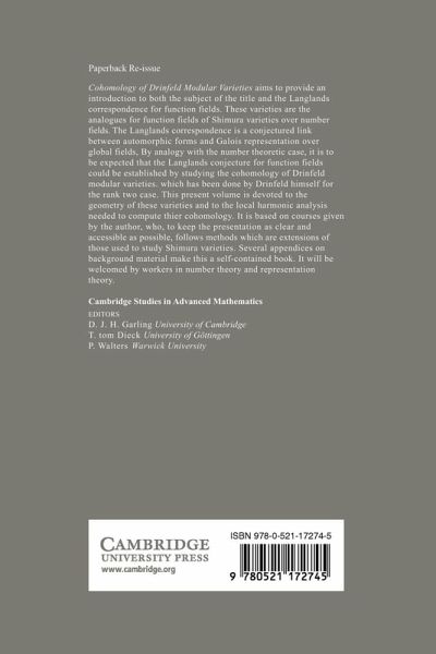 Originally published in 1995, Cohomology of Drinfeld Modular Varieties aimed to provide an introduction, in two volumes, both to this subject and to the Langlands correspondence for function fields. These varieties are the analogues for function fields of the Shimura varieties over number fields. The Langlands correspondence is a conjectured link between automorphic forms and Galois representations over a global field. By analogy with the number-theoretic case, one expects to establish the conjecture for function fields by studying the cohomology of Drinfeld modular varieties, which has been done by Drinfeld himself for the rank two case. The present volume is devoted to the geometry of these varieties, and to the local harmonic analysis needed to compute their cohomology. Though the author considers only the simpler case of function rather than number fields, many important features of the number field case can be illustrated.