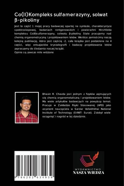 Jest to cz¿¿¿ 1 mojej pracy badawczej opartej na syntezie, charakterystyce spektroskopowej, badaniach rentgenowskich i powierzchni Hirshfelda kompleksu Co(II)sulfamerazyny, solwatu ¿-pikoliny. Stale pracujemy nad chemi¿ organometryczn¿ i projektowaniem leków. Wkrótce zamie¿cimy nasz¿ kolejn¿ publikacj¿, która jest cz¿¿ci¿ -2, cäa ksi¿¿ka jest podzielona na 4 cz¿¿ci, wi¿c entuzjastów krystalografii i badaczy projektowania leków zapraszamy do ¿ledzenia naszej ksi¿¿ki. Opinie s¿ zawsze mile widziane