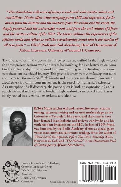 The diverse voices in the poems in this collection are unified in the single voice of the omnipresent persona who appears to be searching for a collective voice, some kind of order or rhythm that would impose meaning to life. Reading the poems constitutes an individual journey. This poetic journey from Awakening that takes the reader to Moonlight Spells & Wreaths and leads her/him through Laments to the Epilogue is a continuous movement in the search for humanity's existence. As a metaphor of self-discovery, the poetic quest is both an expression of, and a search for mankind's elusive self-that single, unbroken umbilical cord that is firmly rooted in the African experience and identity. Ba'bila Mutia teaches oral and written literatures, creative writing, advanced writing and research methodology, at the University of Yaoundé I. His poetry and short stories have been featured in anthologies and reviews worldwide, and his work has been broadcast on the BBC. In June of 1993 Mutia was honoured by the Berlin Academy of Arts as special guest writer in an international writers' reading. He is the author of Whose Land? (Longman), Before This Time, Yesterday (Silex/Nouvelles du Sud) and "The Miracle" in the Heinemann Book of Contemporary African Short Stories.