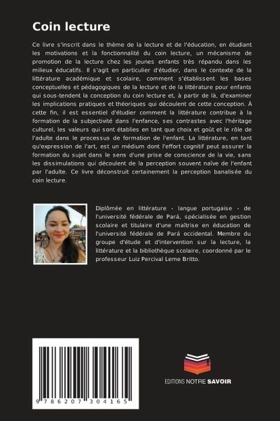 Ce livre s'inscrit dans le thème de la lecture et de l'éducation, en étudiant les motivations et la fonctionnalité du coin lecture, un mécanisme de promotion de la lecture chez les jeunes enfants très répandu dans les milieux éducatifs. Il s'agit en particulier d'étudier, dans le contexte de la littérature académique et scolaire, comment s'établissent les bases conceptuelles et pédagogiques de la lecture et de la littérature pour enfants qui sous-tendent la conception du coin lecture et, à partir de là, d'examiner les implications pratiques et théoriques qui découlent de cette conception. À cette fin, il est essentiel d'étudier comment la littérature contribue à la formation de la subjectivité dans l'enfance, ses contrastes avec l'héritage culturel, les valeurs qui sont établies en tant que choix et goût et le rôle de l'adulte dans le processus de formation de l'enfant. La littérature, en tant qu'expression de l'art, est un médium dont l'effort cognitif peut assurer la formation du sujet dans le sens d'une prise de conscience de la vie, sans les dissimulations qui découlent de la perception souvent naïve de l'enfant par l'adulte. Ce livre déconstruit certainement la perception banalisée du coin lecture.
