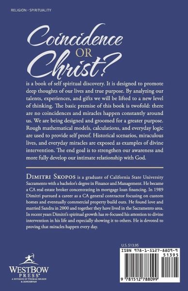 is a book of self spiritual discovery. It is designed to promote deep thoughts of our lives and true purpose. By analyzing our talents, experiences, and gifts we will be lifted to a new level of thinking. The basic premise of this book is twofold: there are no coincidences and miracles happen constantly around us. We are being designed and groomed for a greater purpose. Rough mathematical models, calculations, and everyday logic are used to provide self proof. Historical scenarios, miraculous lives, and everyday miracles are exposed as examples of divine intervention. The end goal is to strengthen our awareness and more fully develop our intimate relationship with God.